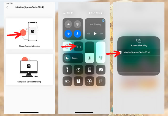 - For iOS, tap Phone Screen Mirroring, show the Control center and hit the Screen Mirroring icon, and choose the name of your PC again to start mirroring.