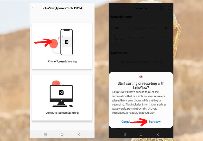 - For Android, hit Phone Screen Mirroring and tap Start Now.