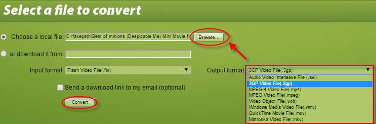 We are able to add a local file by a hit on the “Browse” button and it lets us to download a web file to Convert.Files directly by entering the URL. Then this FLV to 3GP converter will analysis the format of that input file automatically. Relatively, if the source file is not in the input format list, in other words, it cannot be uploaded to Convert.Files.