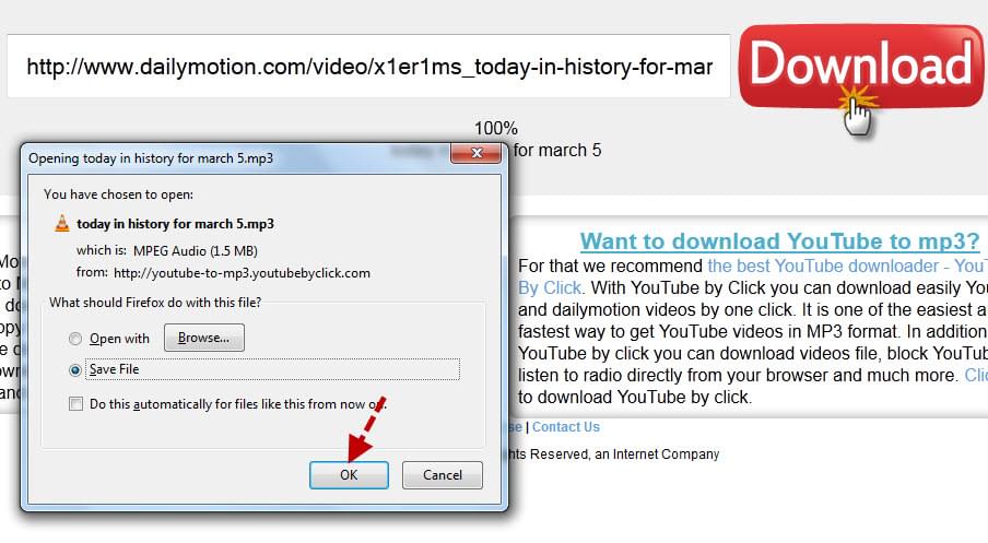 The concrete guide of this converter is similar to the above one as instructed. You just need to bring the Dailymotion link address to URL box on Dailymotion to MP3 site, and then press “Download” icon. After processing, a window will show up and ask you to save the MP3 to local disk. You can hit “OK”, then the file will be downloaded to your computer.