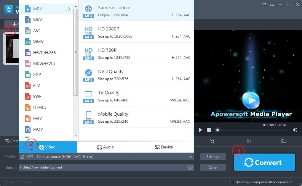 All those tools described above are online ways to convert DVD to MP4, which might be disturbed by poor net connections. In that case, the desktop program may be a better alternative for you to do this task in a more stable and reliable way. Here I want to share you a fantastic DVD to MP4 converter program – Apowersoft Video Converter Studio. It is a professional video converting software that supports many regular video and audio formats, which can satisfy your various requirements. To get a more general idea of this program, let’s see the detailed instructions of how to convert DVD to MP4: