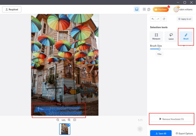 - Upload the image and brush the watermark off then hit Remove Now.