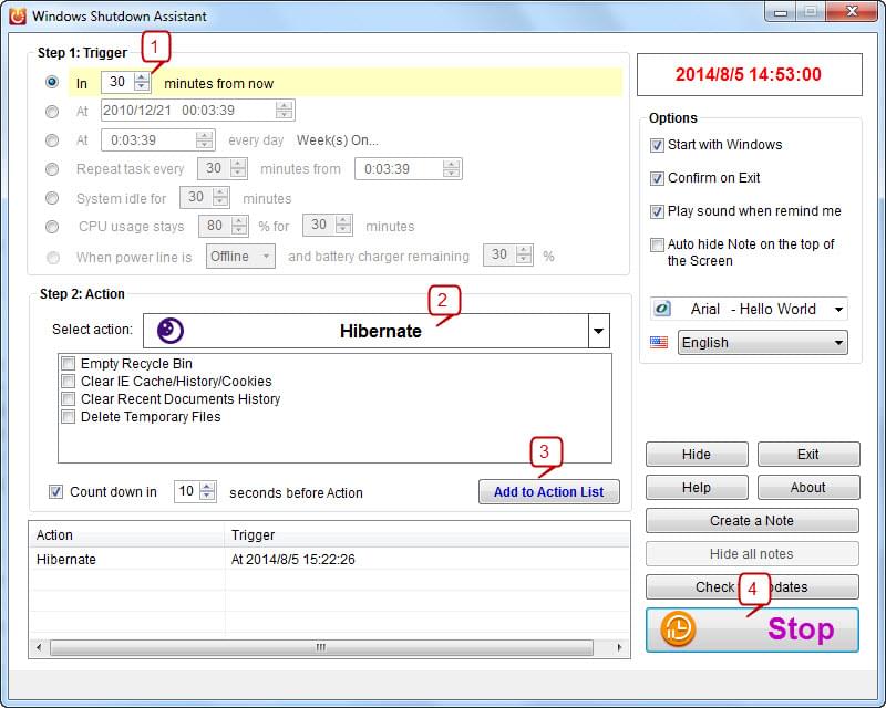 Do not forget to save the selected task by clicking “Add to action list” and “Start”. Simultaneously you could also do other things such as automatically set your computer to shutdown, restart or sleep, select a certain program or application to run at a specific time, edit and personalize on-screen reminders and many more. Aside from the fact that you can easily hibernate Windows 8, you’ll get to enjoy tons of other benefits from Windows Shutdown Assistant as well. It acts as your personal secretary which lets you automate many tasks with simple scrolls and click.