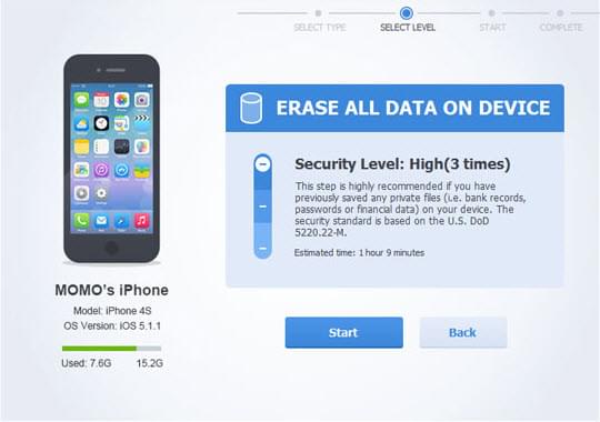 High: This level is the safest data erasure option. It is highly recommended if you have stored your private files like account password, financial data, bank record on your iDevices. But the high level takes longer than the previous two levels.