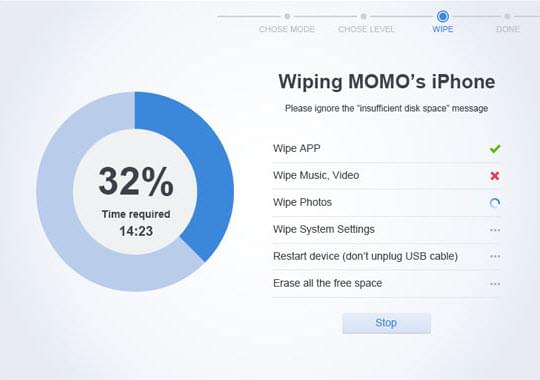Low: In the low erasing level, you can wipe off data on your iOS device quickly. You can save much time if you select this level.