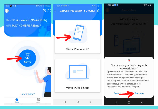 • On your Android phone, tap the blue Mirror icon > Mirror Phone to PC > Start Now then the mirroring process will begin.