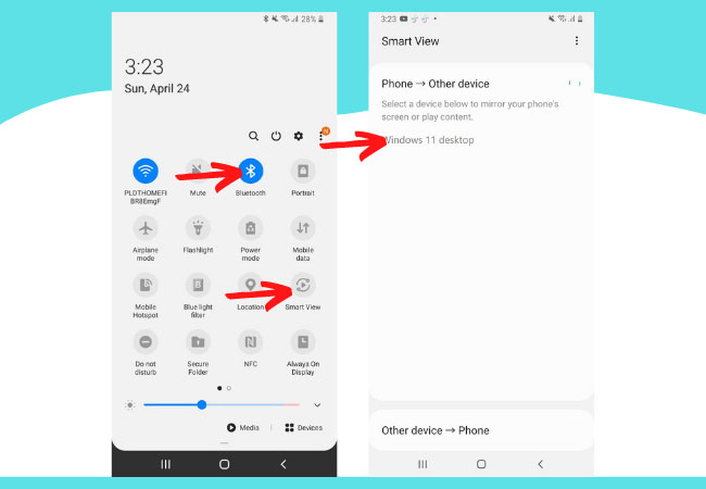 • On the other hand, on your Android phone, show the Notification panel, turn on the Bluetooth and tap the Smart View > choose your Windows 11 from the list to start casting your Android phone to your Windows 11.