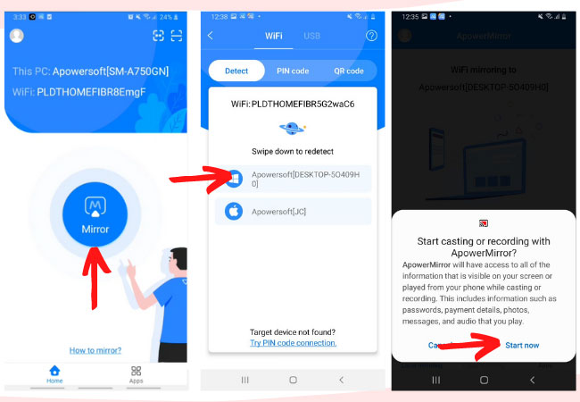 - Launch the app on both PC and Xiaomi phones. Tap the mirror button, choose the name of your PC then hit Start Now to start mirroring.