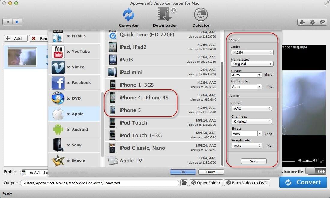 Also forward to select the option “to Apple”, a particular panel which grants you to adjust the parameters (codec, frame size/rate, channels, etc) of the video will appear on the right part of the interface. keep the settings intact if you don’t have special needs on customizing the video.