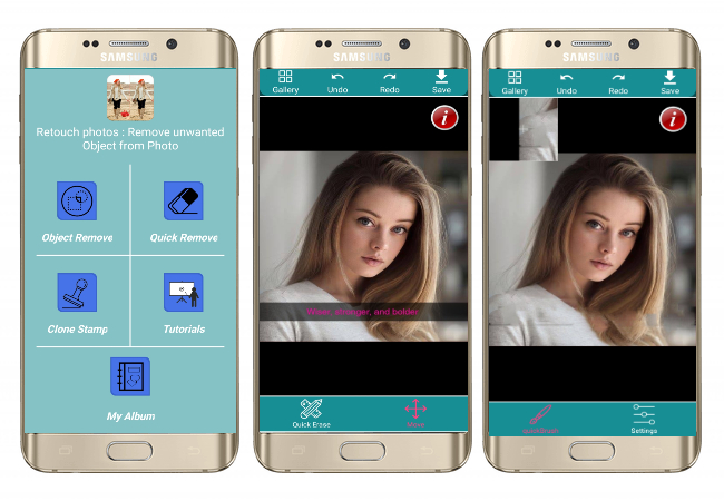 Remove Unwanted Content can help you remove Snapchat caption from picture too. This app is available for free to all Android users. You can use its removing features: object remove, quick remove, and clone stamp to erase undesired objects. In addition to that, you can add some effects, stickers, and text your image before you save the processed image. Here are the steps that you can know how to remove caption from Snapchat picture using this app.