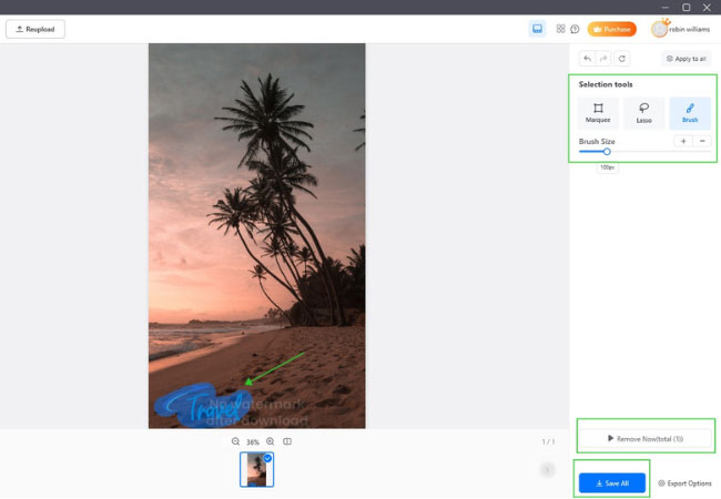 - Choose from the Selection tools to mark the watermark > Remove now then click Save All.