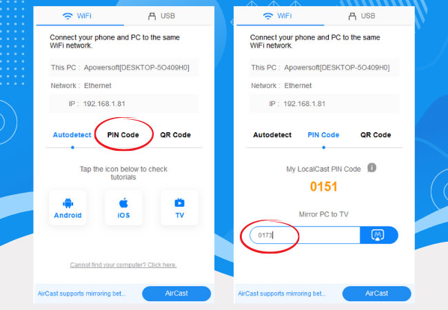 - Click on PIN code then input the PIN code displayed on your TV to start mirroring.