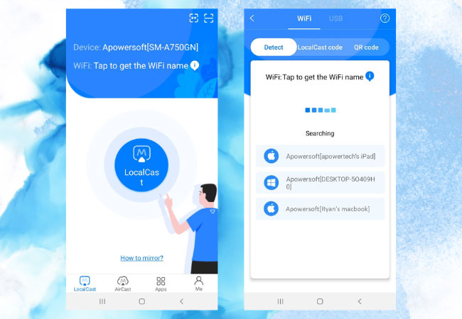 • You can also connect your Android device to PC via the same WiFi. Tap the blue button to search for your device. Then you are supposed to choose the computer name including “Apowersoft”.