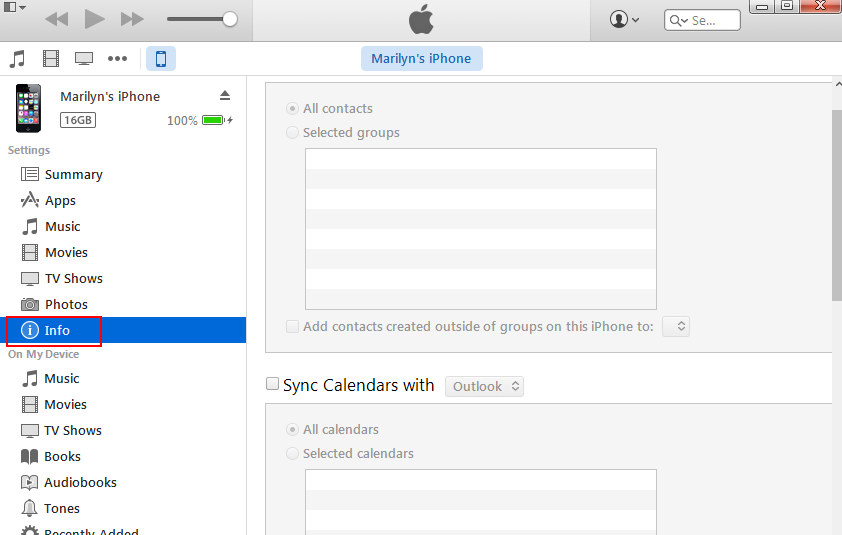 - Next, open “Info” tab, check on “Sync Contacts with:”under Contacts label and drop it down and select “Outlook”.