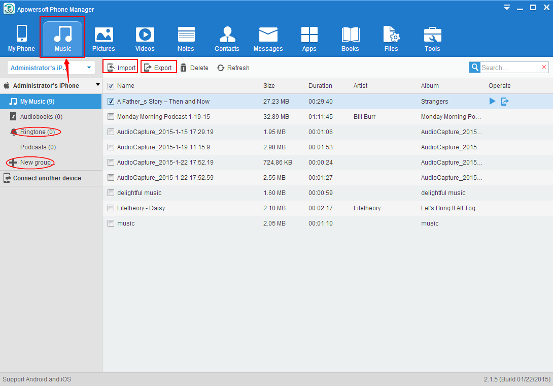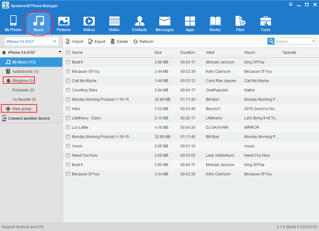 • After entering the interface, click “Music” icon on the top. Under music menu, you will see all existing iPhone music. You can import downloaded music from PC or other devices to iPhone, export iPhone music to computer, iPhone or Android smartphones. Just a few clicks, you can transfer music to iPhone.