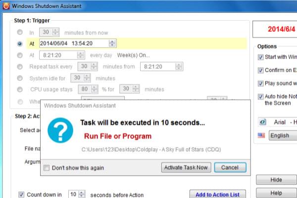 Windows Shutdown Assistant supports you to create tasks for opening files, URLs or launch programs automatically. By utilizing this function, you won't forget the important events anymore. The software will prompt you to work on a document or check a website at specific time. It's convenient to create several tasks to perform specified actions for the whole period in a day, improving your efficiency greatly.